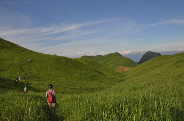 武功山的風(fēng)景很美,特別是云霧繚繞,陽光跳躍的時(shí)候。深淺不一的草甸,輕紗薄霧繚繞的山頭。
