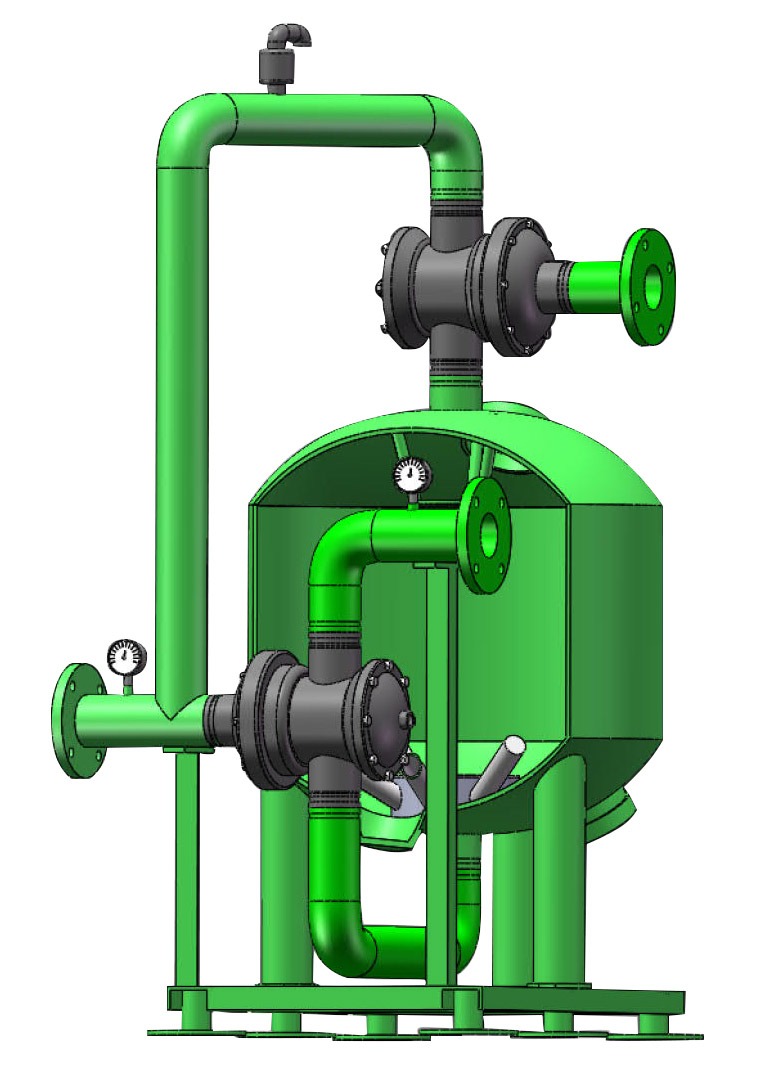 當(dāng)系統(tǒng)處于過(guò)濾狀態(tài)時(shí),加壓水從濾罐進(jìn)口流入布水系統(tǒng),均勻的到達(dá)濾料層。當(dāng)水流過(guò)濾料層時(shí),懸浮物被濾料截留。過(guò)濾器底部有帶縫隙的集水器,過(guò)濾后的干凈水被均勻收集,并流出過(guò)濾器。