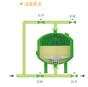 隨時(shí)雜質(zhì)在濾料層中不斷聚積,壓力損失不斷增加,當(dāng)壓差增加到某一設(shè)定值時(shí)或到達(dá)設(shè)定的清洗時(shí),系統(tǒng)將自動(dòng)轉(zhuǎn)換至反洗狀態(tài)。加壓水通過集水裝置進(jìn)入濾料層,對(duì)其進(jìn)行沖刷,使截留的污染物脫落并排出過濾系統(tǒng)。反洗持續(xù)至少2分鐘后,閥門自動(dòng)將系統(tǒng)轉(zhuǎn)至過濾狀態(tài)。